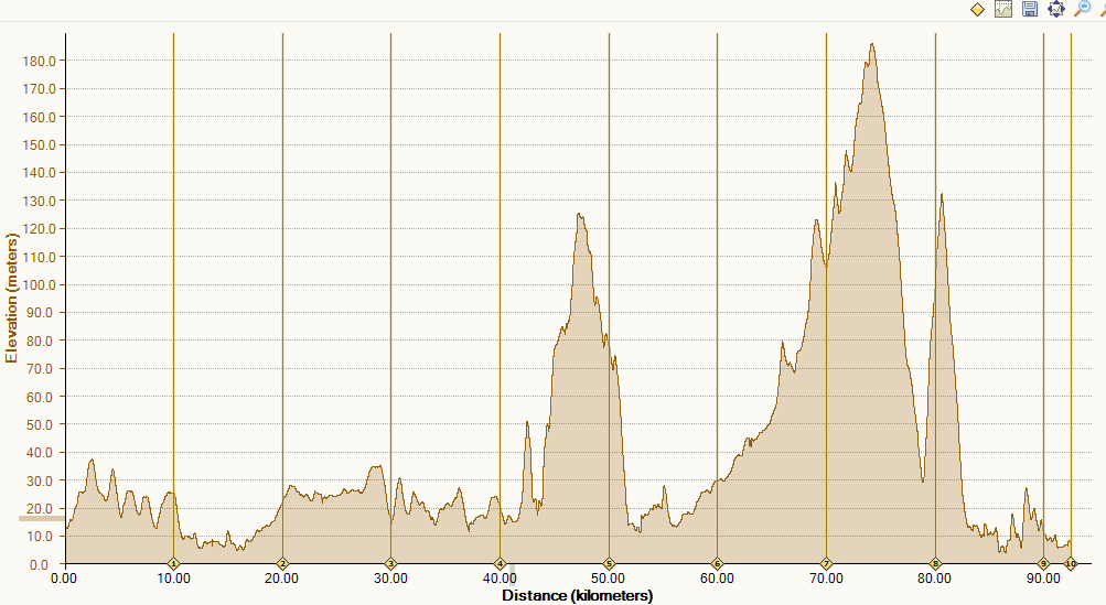 Around 72 kilometers we first felt the breeze, then we could see it. We’d reached the ocean. It felt great, like we were explorers looking for a route across a fresh continent. We’d finally got to the sea. And the cycling got easier too. We dropped a hundred and fifty meters over four or five kilometers. After all the slow progress we were flying.