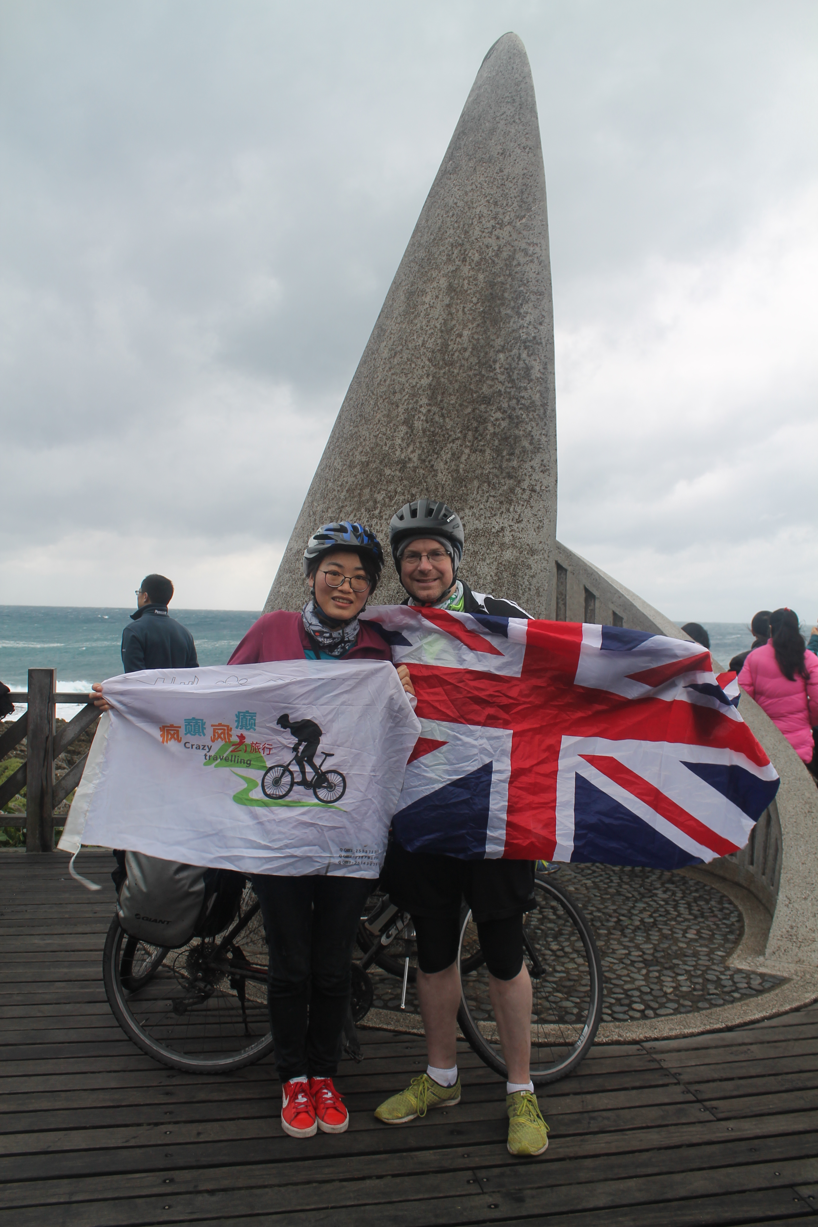 Just after 40k we reached a steep hill climbing 40 meters before turning off the main road to reach the southernmost tip of the island. I thought I might have had to use a map to find this place but there was no need. The place was mobbed with tourists and we had plenty of signs marking the way. It was great to arrive. We unfurled Ning’s bicycle club flag and my union jack and took some photos to mark the occasion. It wasn’t even lunch time and we’d made our first objective for the day. It felt good.