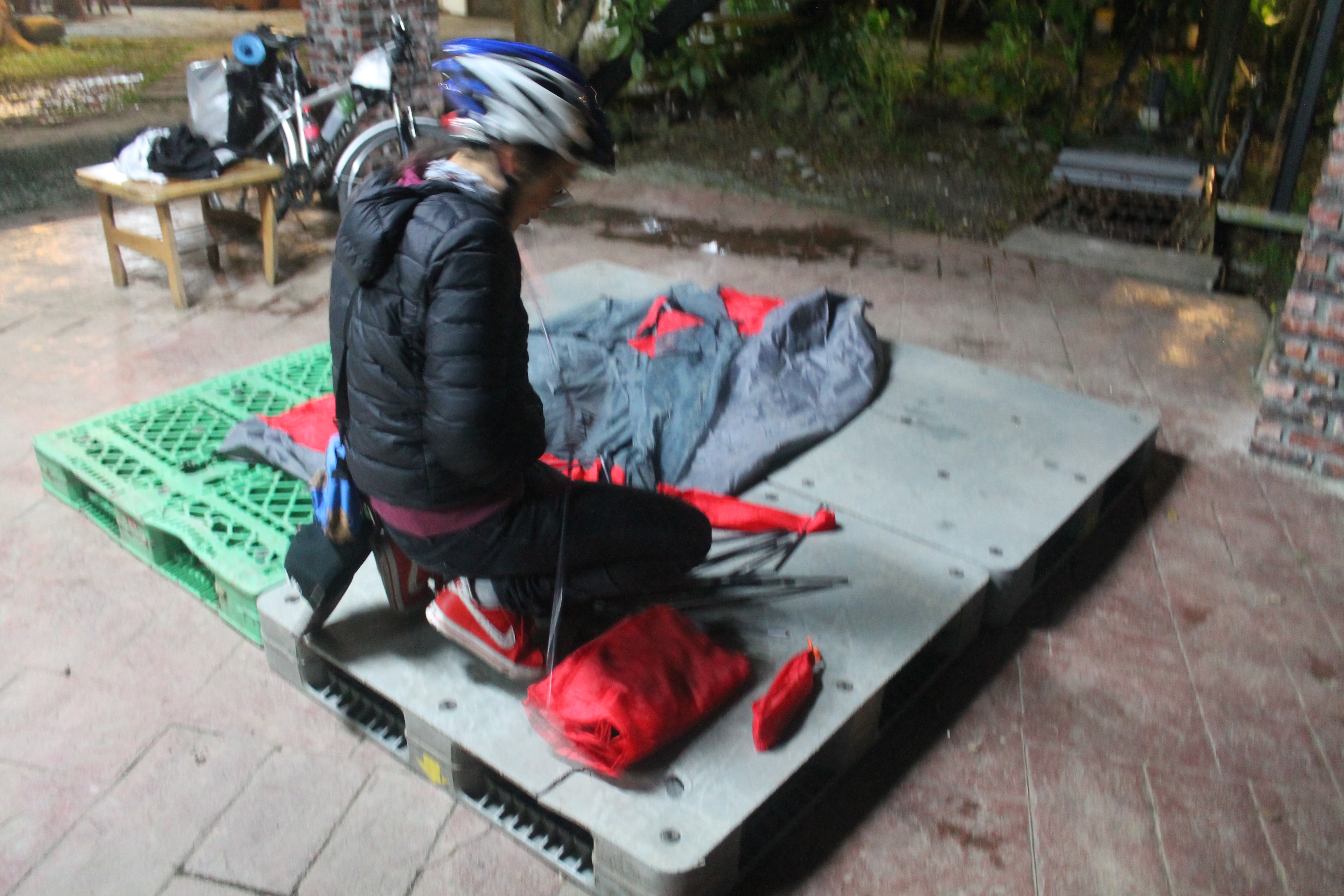 The wind was in our faces again cycling along the coast and my legs and backside were really starting to hurt, but the end was in sight and I knew we could rest soon. We even ran into some other cyclists who’d stopped to repair one of their party’s bikes. These guys were also heading for a campsite in Pingtung county so it seems we weren’t lost. A few more kilometers in the wet wind and we’d be there.